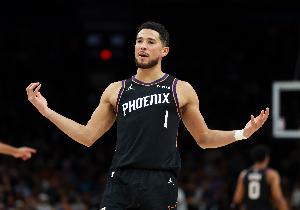 “布克压轴登场,开局10连中!超远也进了,45度角全中,眼看要封神……结果花球筐只进了2个,27分,差2分惜败!