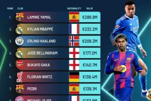 Football Benchmark全球身价前十:亚马尔2.868亿欧第1,3人破2亿