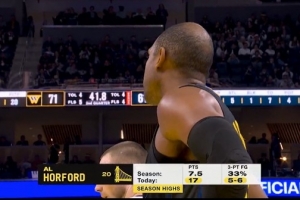 上半场,勇士老将霍福德表现神勇,出场14分钟8投6中,三分6中5砍下个人赛季新高17分外加1篮板4助攻2抢断1盖帽,正负值+14。