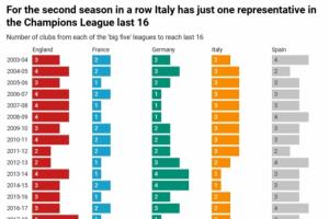五大联赛晋级欧冠16强数量:英超本赛季6队,意甲连续2赛季仅1队