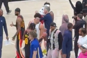 这是库明加被交易后首次面对老东家,赛后他和前队友拥抱致意,也和主教练科尔简单握手拥抱,最后还和库里聊了一会。